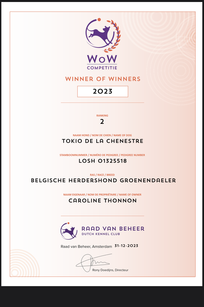 De individuele hond met het hoogste aantal punten van het ras wint aan het einde van het jaar de 'Winner of Winners'-titel. Alle rassen komen aan bod. Onze Tokio kreeg de tweede prijs onder de Groenendaelers.